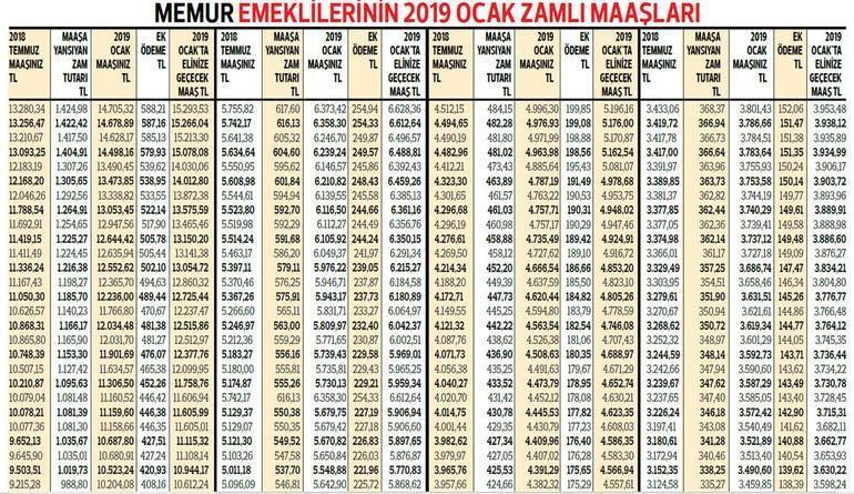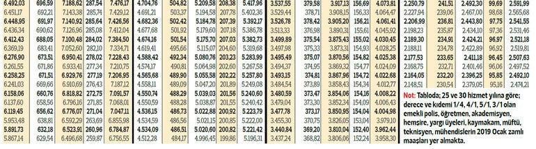 Not: Tabloda; 25 ve 30 hizmet yılına göre; derece ve kıdemi 1/4, 4/1, 5/1, 3/1 olan emekli polis, öğretmen, akademisyen, hemşire, yargı üyeleri, kaymakam, müftü, teknisyen, mühendislerin 2019 Ocak zamlı maaşları yer almakta.