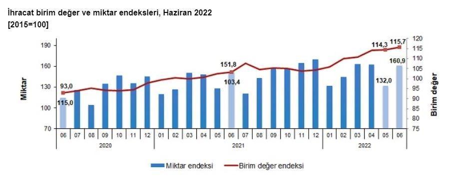 İhracat birim değer endeksi Haziran ayında bir önceki yılın aynı ayına göre yüzde 12,0 arttı. Endeks bir önceki yılın aynı ayına göre, gıda, içecek ve tütünde yüzde 7,5 azalırken, ham maddelerde (yakıt hariç) yüzde 18,2, yakıtlarda yüzde 89,5 ve imalat sanayinde (gıda, içecek, tütün hariç) yüzde 11,1 arttı.