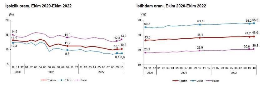 Hanehalkı İşgücü Araştırması sonuçlarına göre; 15 ve daha yukarı yaştaki kişilerde işsiz sayısı 2022 yılı Ekim ayında bir önceki aya göre 57 bin kişi artarak 3 milyon 534 bin kişi oldu. İşsizlik oranı ise 0,1 puanlık artış ile yüzde 10,2 seviyesinde gerçekleşti. İşsizlik oranı erkeklerde yüzde 8,6 iken kadınlarda yüzde 13,3 olarak tahmin edildi.