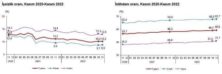 İstihdam edilenlerin sayısı 2022 yılı Kasım ayında bir önceki aya göre 285 bin kişi artarak 31 milyon 574 bin kişi, istihdam oranı ise 0,4 puanlık artış ile %48,6 oldu. Bu oran erkeklerde %65,7 iken kadınlarda %31,7 olarak gerçekleşti.