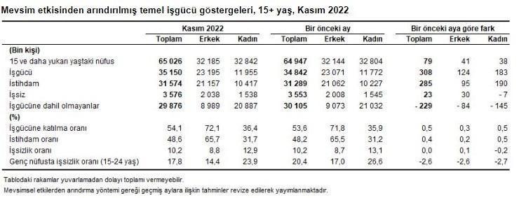 Hanehalkı İşgücü Araştırması sonuçlarına göre; 15 ve daha yukarı yaştaki kişilerde işsiz sayısı 2022 yılı Kasım ayında bir önceki aya göre 23 bin kişi artarak 3 milyon 576 bin kişi oldu. İşsizlik oranı ise değişim göstermeyerek %10,2 seviyesinde gerçekleşti. İşsizlik oranı erkeklerde %8,8 iken kadınlarda %12,9 olarak tahmin edildi.