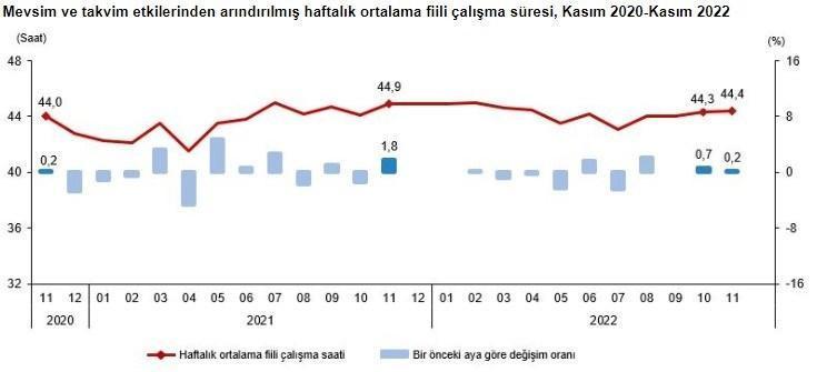 İstihdam edilenlerden referans döneminde işbaşında olanların, mevsim ve takvim etkilerinden arındırılmış haftalık ortalama fiili çalışma süresi 2022 yılı Kasım ayında bir önceki aya göre 0,1 saat artarak 44,4 saat olarak gerçekleşti.