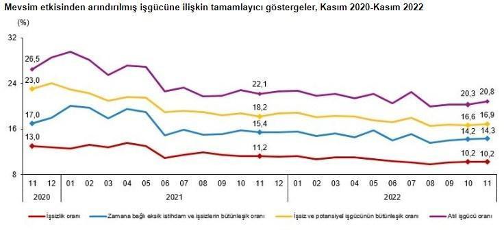 Zamana bağlı eksik istihdam, potansiyel işgücü ve işsizlerden oluşan atıl işgücü oranı 2022 yılı Kasım ayında bir önceki aya göre 0,5 puanlık artış ile %20,8 oldu. Zamana bağlı eksik istihdam ve işsizlerin bütünleşik oranı %14,3 iken potansiyel işgücü ve işsizlerin bütünleşik oranı %16,9 olarak tahmin edildi.