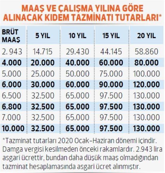 Yeni yılda asgari ücretin netleşmesi ile birlikte 2020’nin ilk yarısında işçilerin, işten ayrılırken işverenden alacakları kıdem tazminatı da arttı. Kıdem tazminatının tavanı ne oldu, çalışma yılına göre kimler, ne kadar tazminat alacak sorularına açıklık getirmeden önce kıdem tazminatı ile ilgili önemli bir-iki konuya değineyim. Kıdem tazminatı tutarı ocak-temmuz, temmuz-aralık olmak üzere senede iki kere değişiyor, bu değişikliği de Hazine ve Maliye Bakanlığı açıklıyor. Buna göre 2020’nin ilk yarısında işçilere ödenecek kıdem tazminatının yıllık tavanı 6.730.15 lira oldu. Bu da şu anlama geliyor, bu yıl, işçilere ödenecek tazminat 6.730.15 liranın üzerinde olmayacak. Tazminat tavanı 2019’un ikinci yarısında 6.379.86 liraydı. Böylece kıdem tazminatı 2020’de yüzde 5.49 artmış oldu.