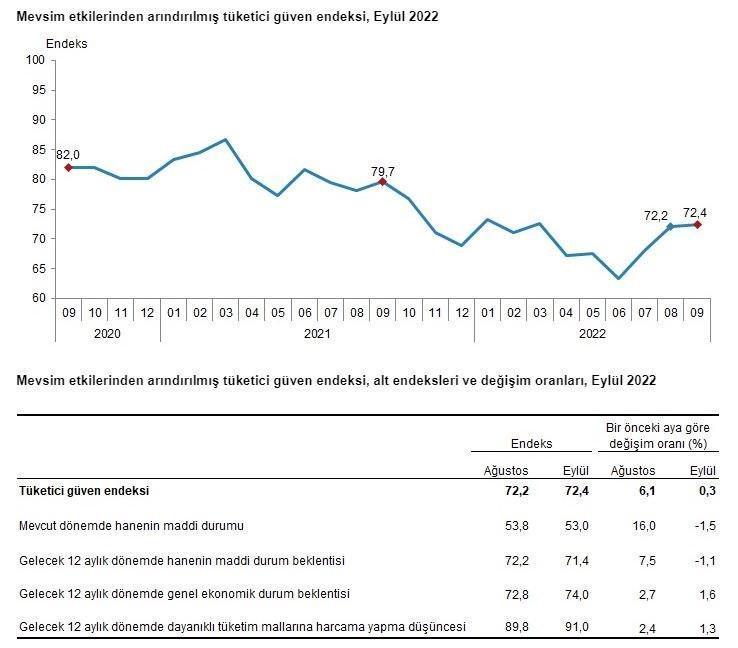 Türkiye İstatistik Kurumu ve Türkiye Cumhuriyet Merkez Bankası işbirliği ile yürütülen tüketici eğilim anketi sonuçlarından hesaplanan mevsim etkilerinden arındırılmış tüketici güven endeksi, Eylül ayında bir önceki aya göre yüzde 0,3 oranında arttı; Ağustos ayında 72,2 olan endeks, Eylül ayında 72,4 oldu.