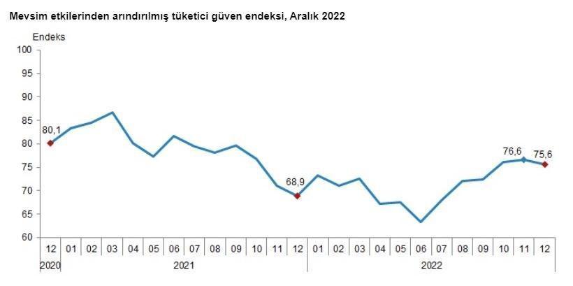 Türkiye İstatistik Kurumu ve Türkiye Cumhuriyet Merkez Bankası işbirliği ile yürütülen tüketici eğilim anketi sonuçlarından hesaplanan mevsim etkilerinden arındırılmış tüketici güven endeksi, Aralık ayında bir önceki aya göre yüzde 1,3 oranında azaldı; Kasım ayında 76,6 olan endeks, Aralık ayında 75,6 oldu.