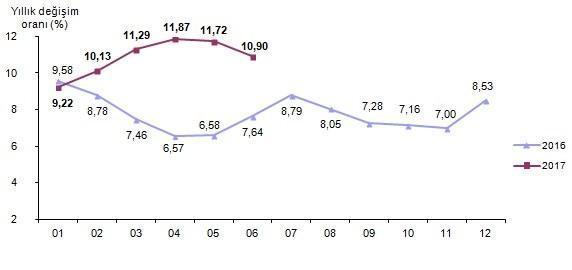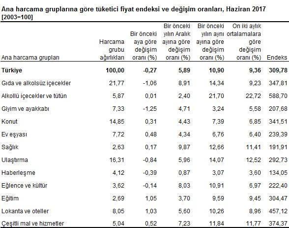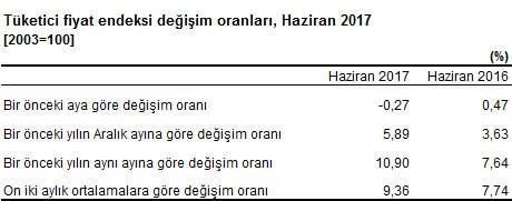 TÜFE’de (2003=100) 2017 yılı Haziran ayında bir önceki aya göre %0,27 düşüş, bir önceki yılın Aralık ayına göre %5,89, bir önceki yılın aynı ayına göre %10,90 ve on iki aylık ortalamalara göre %9,36 artış gerçekleşti.