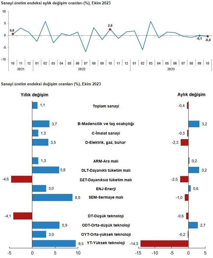Sanayinin alt sektörleri incelendiğinde, 2023 yılı Ekim ayında madencilik ve taş ocakçılığı sektörü endeksi bir önceki aya göre %3,2 artarken, imalat sanayi sektörü endeksi %0,3 ve elektrik, gaz, buhar ve iklimlendirme üretimi ve dağıtımı sektörü endeksi %2,3 azaldı.