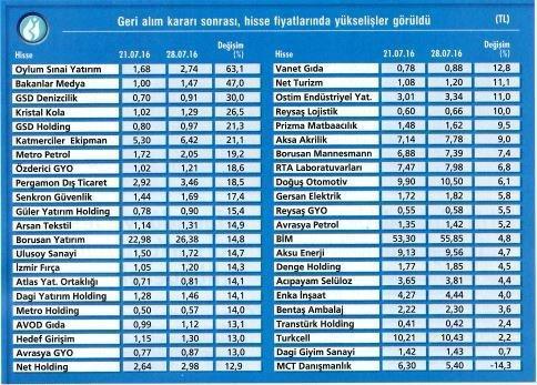 Darbe girişiminin ardından hisse fiyatlarında oynaklıklar meydana geldiğini, sermaye piyasalarında endişenin hakim olduğunu ifade eden Reel Kapital Menkul Değerler Araştırma Uzmanı Enver Erkan, bu gibi borsada volatilitenin yüksek olduğu dönemlerde hisse geri alımının önlem olarak görüldüğünü söylüyor. Erkan, "Hisse geri alımını özellikle 'market mover' dediğimiz endeksteki ağırlığı yüksek şirketlerin yapmasıyla piyasa oynaklığının önüne geçiliyor" diyor. Enver Erkan, geri alımla şirketlerin kendi hisselerinin, SPK'nın da şirketlerin arkasında olduğu anlamının çıktığı görüşünü paylaşıyor.
